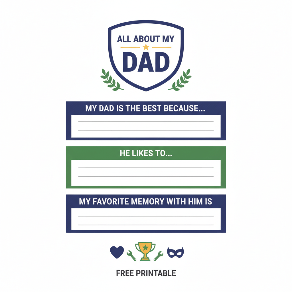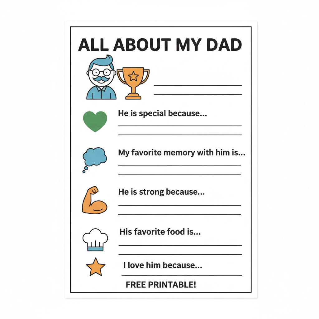 Looking for a heartfelt and fun way for your kids to express their love for Dad? This 'All About My Dad' free printable is the perfect solution! This engaging activity is designed for kids of all ages to answer questions and draw pictures all about their awesome dads. It's a wonderful keepsake that Dad will treasure for years to come. This fre...