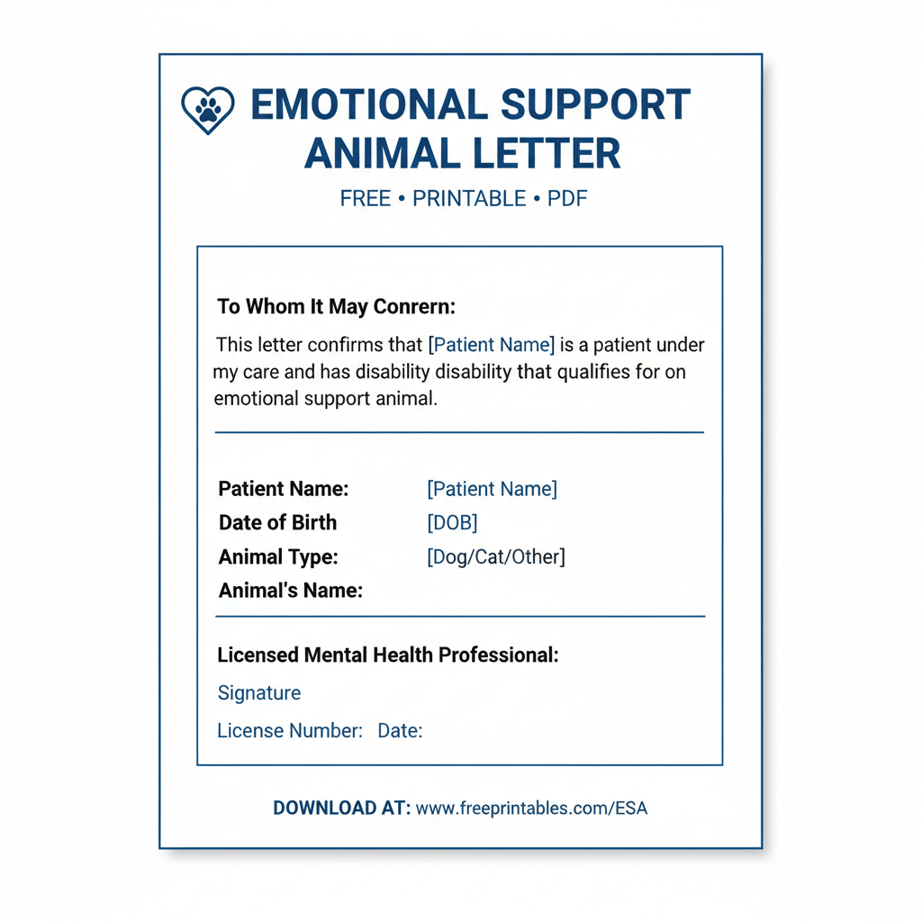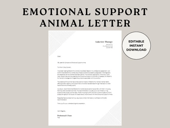 Need an emotional support animal letter? We offer a free, printable PDF template to help you get started. This letter can be used to support your request for reasonable accommodations for your ESA in housing or travel. Please note that this is a template and should be reviewed and completed with the guidance of a licensed mental health professio...
